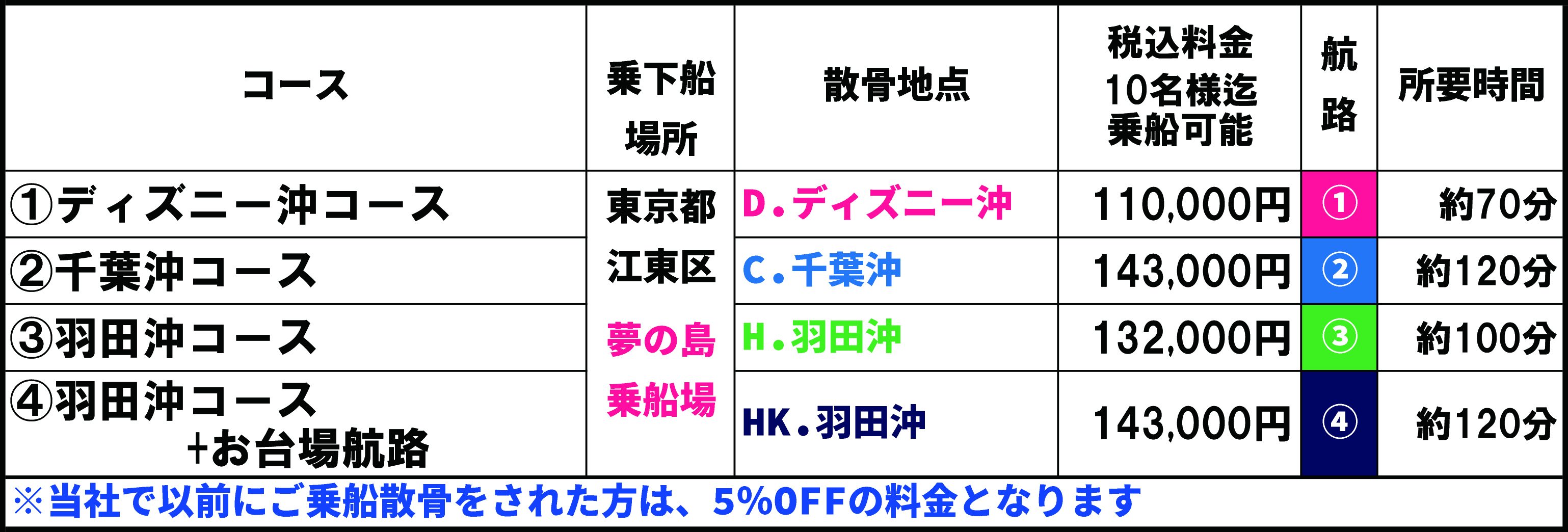 当社からご希望の海域までの移動費(別表)+各プラン基本料金で日本全国の海域へご散骨致して